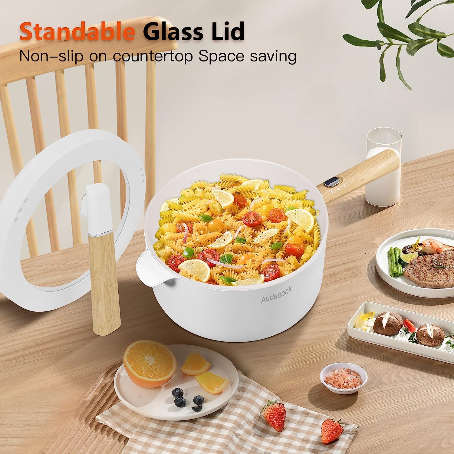 VERTICAL TEMPERED GLASS LID-The tempered glass lid of the Audecook electric multi cooker is heat-resistant and explosion-proof. You can check and control the status of your non stick frying pan at any time, and retain the heat and flavor of your food during the cooking process, so your food comes out perfectly every time. At the same time, the vertical design can stand the glass cover on the desktop, saving more space for your desktop!