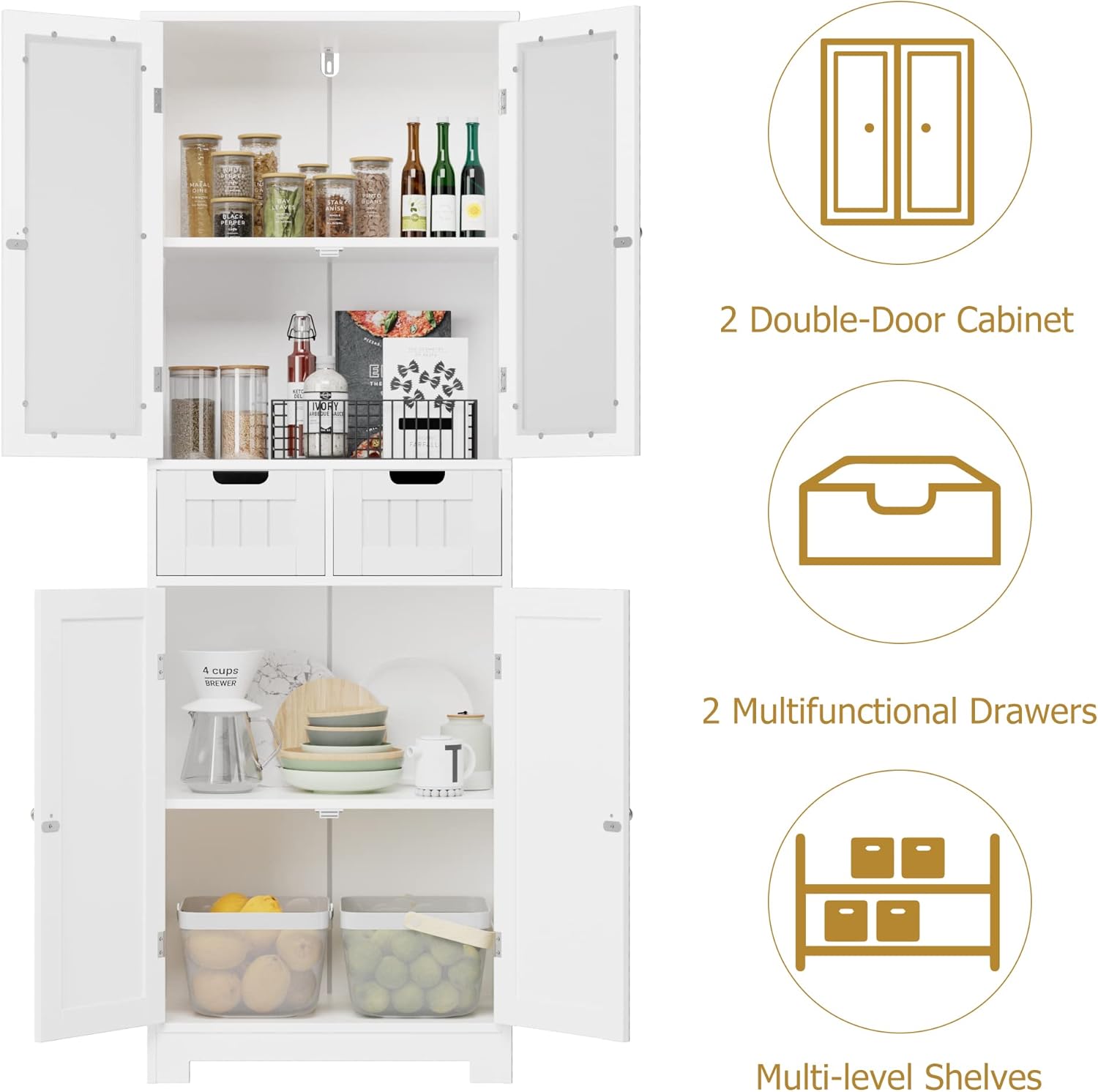 Multifunctional: With its simple design, this storage cabinet is suitable for multiple rooms in the house. It can be used as a bathroom cabinet in the bathroom, as a bookcase in the study, as a sideboard in the dining room, as a buffet in the kitchen and as a glass display cabinet in the living room.