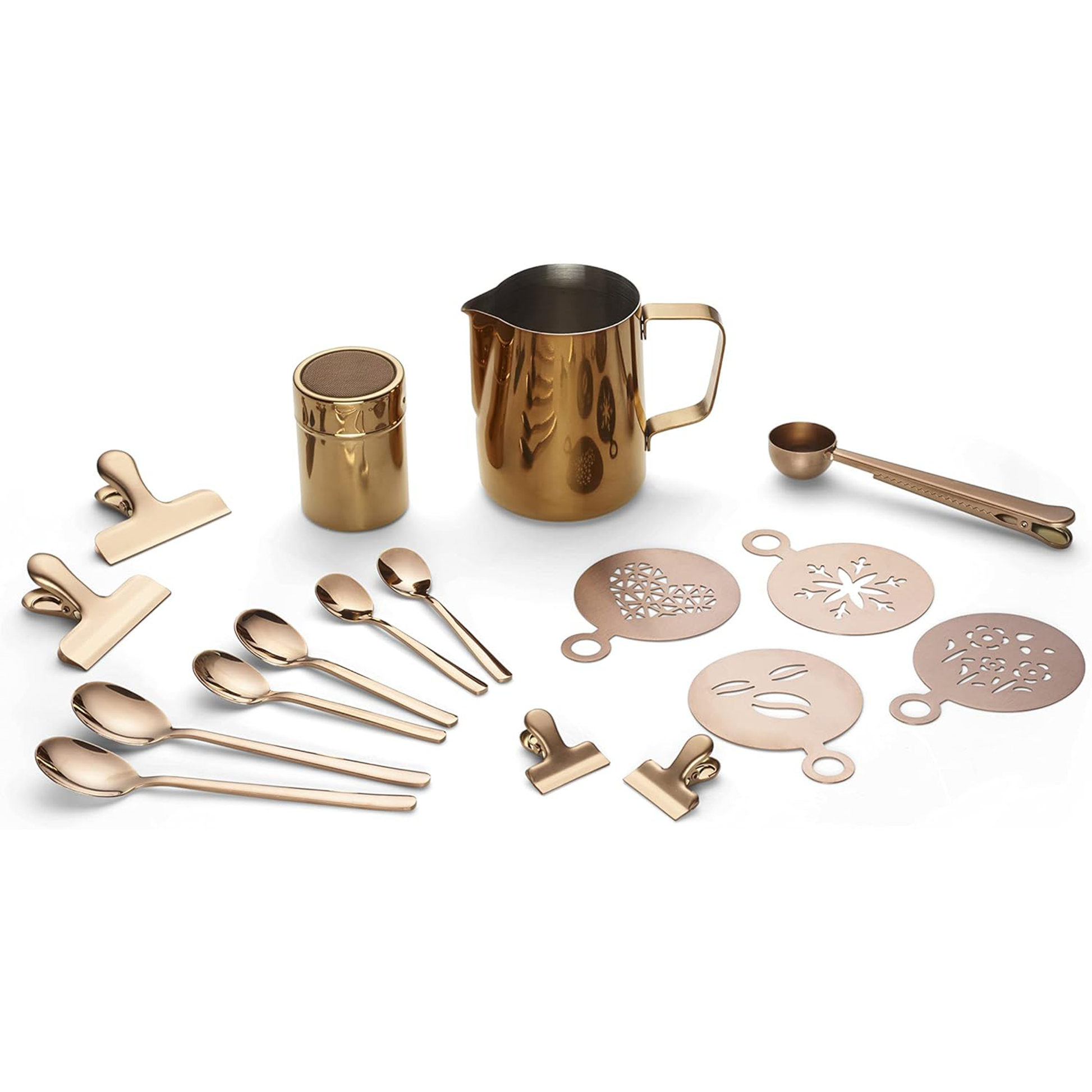 Decorative and stylish coffee accessory set made of high-quality stainless steel consisting of: 1 x milk jug approx. 600ml Matte interior / polished exterior (not microwave safe), 1 x cocoa shaker approx. 6 x 8 cm, 4 x espresso spoons approx. 11 cm, 4 x cappuccino spoons approx. 13 cm, 4 x latte macchiato spoons approx. 18 cm, 2 x coffee clips approx. 4 cm / 2 x coffee clips approx. 7.5 cm, 4 x coffee stencils approx. 11.5 x 8.5 cm, 1 x coffee measuring spoon.