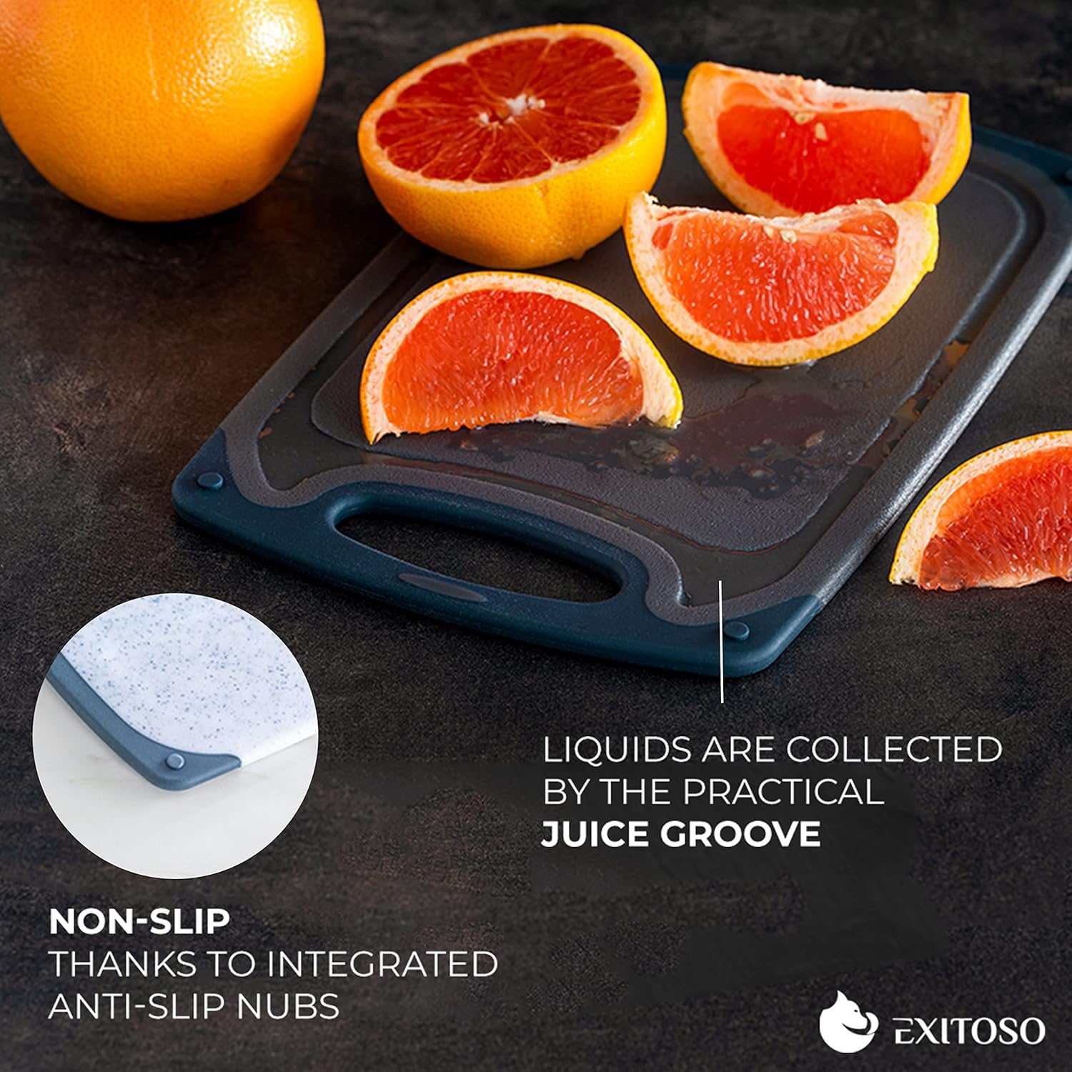 Reversible and Knife-Friendly Cutting Boards: Double sided design, one side with grooves for catching juices, another side has more space for cutting. both surfaces are strong and knives friendly.