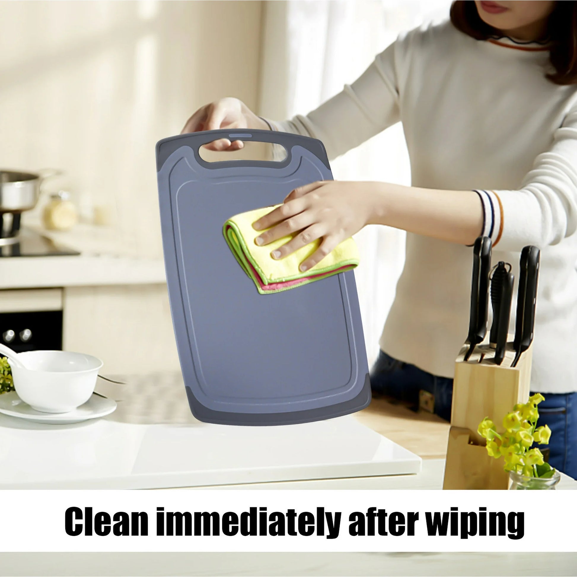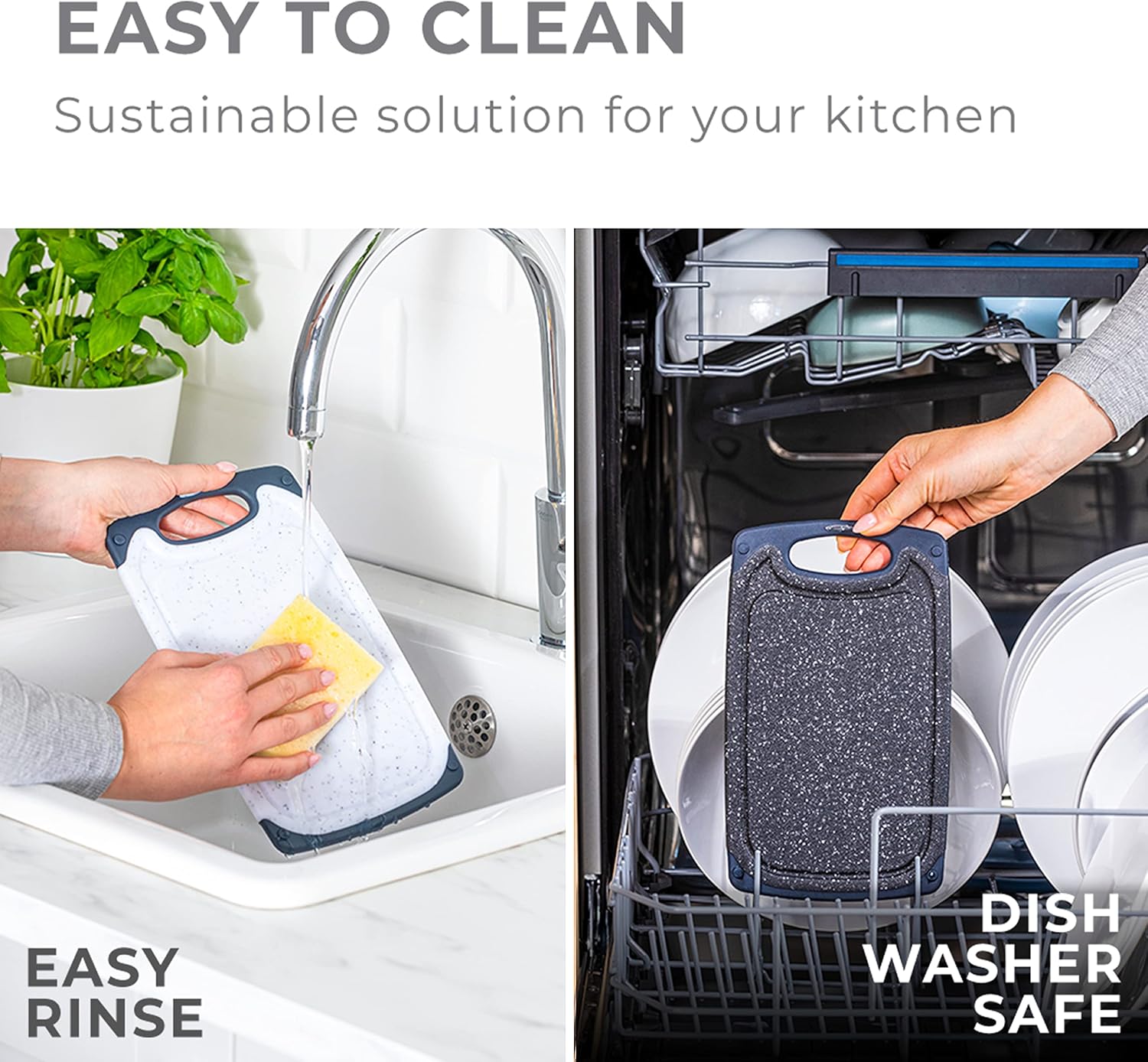 Non-Slip and Dishwasher Safe: Non-slip rubber feet and handle makes plastic cutting board easy to grip and keep these cutting boards stay on the countertop. They are made from thick, heavy-duty plastic, and non-porous design makes them dishwasher safe.