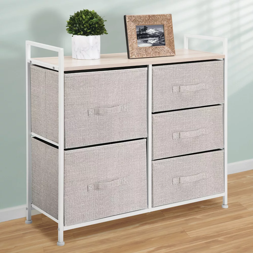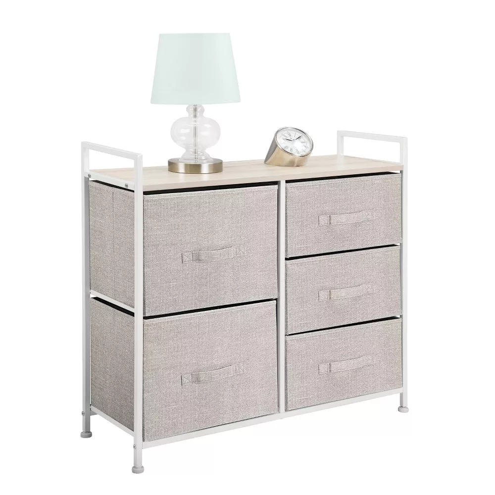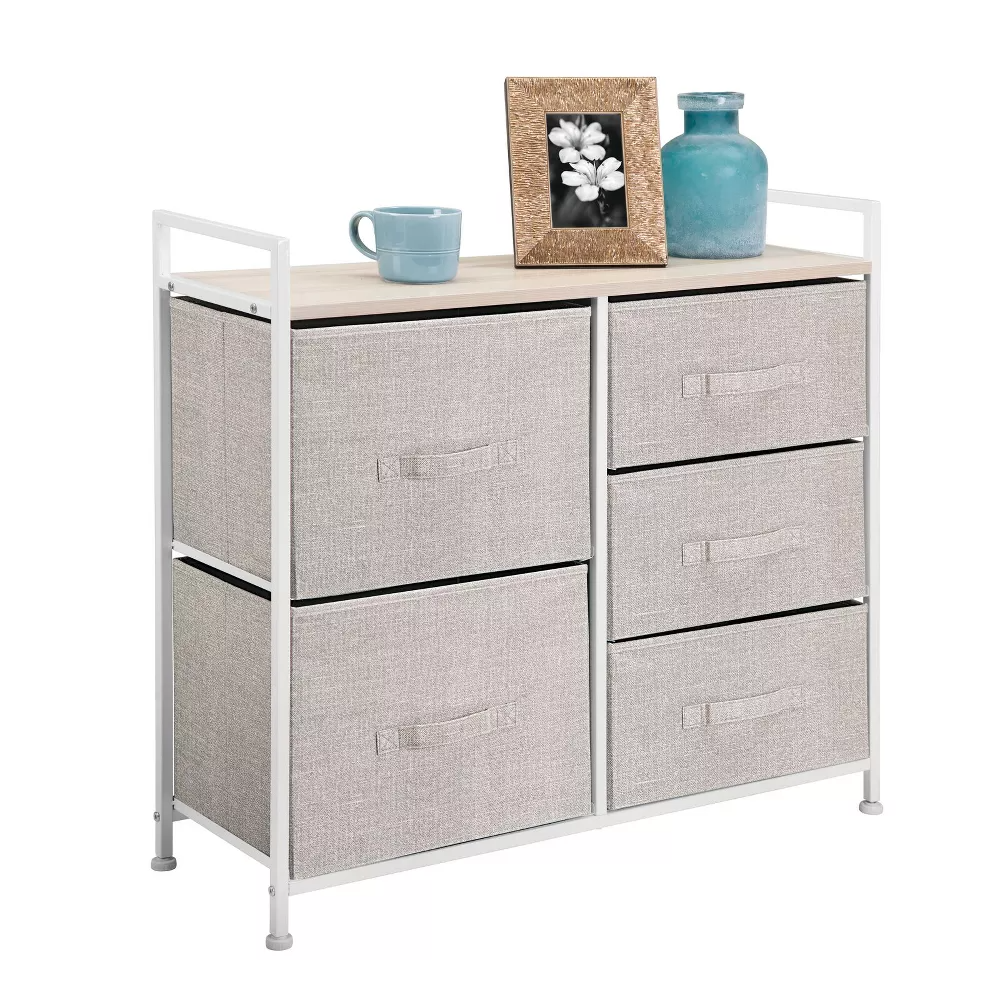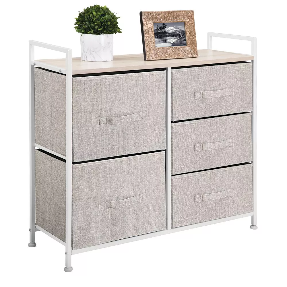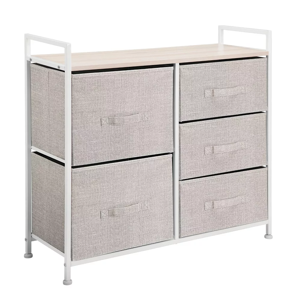 Create stylish storage with this Five Drawer Vertical Dresser Storage Cabinet from mDesign. The organizer separates and stores all of your wardrobe and linen essentials, and make it easy to find and grab what you need right away. Five removable drawers separate and organize clothing and accessories like hats, socks and shoes, scarves, blankets and more in one convenient place. They offer roomy space for storing out of season clothing, shoes, purses, scarves, bedding, linens, and more. The classic fabric adds stylish storage to any bedroom closet, laundry area or other storage space in your home, and a wood top provides a hard surface to place lamps, accessories, home decor and more.
