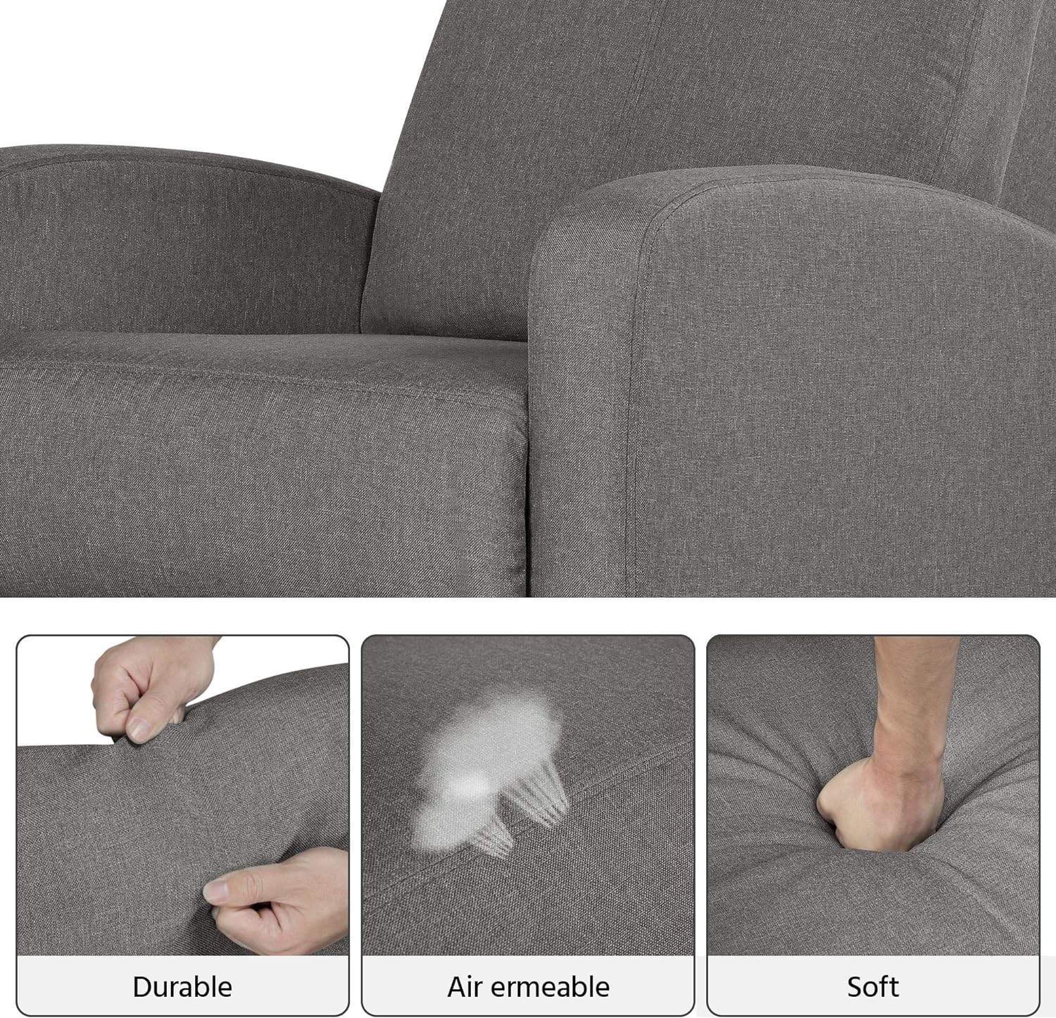 Marshmallow-like softness: The upholstered reclining sofa features a soft-cushioned seat supported by pocket spring, and extra thick foam and rayon fibers filled backrest and footrest. Covering with strong yet soft linen fabric, the excellent texture gives you the ultimate sitting experience.