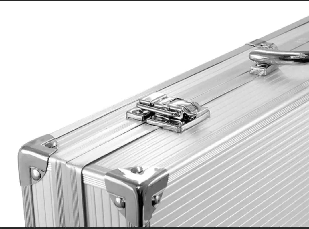 stainless steel barbecue tool kit. It comes in a practical aluminum-framed case, measuring 45x24x8 cm, for easy storage and transport