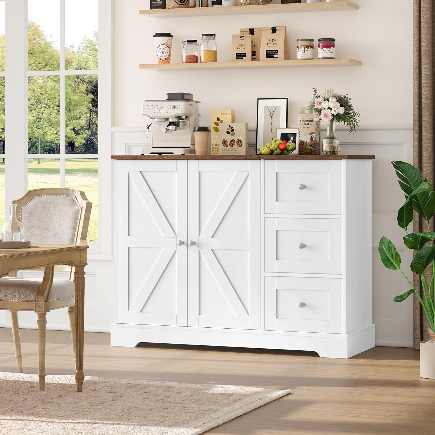 Robust and durable: This white sideboard is made of high-quality wood material, which is durable and not easy to deform and tear. The base is equipped with widened and thickened full sides to ensure stability during use. A good helper for your kitchen and dining room