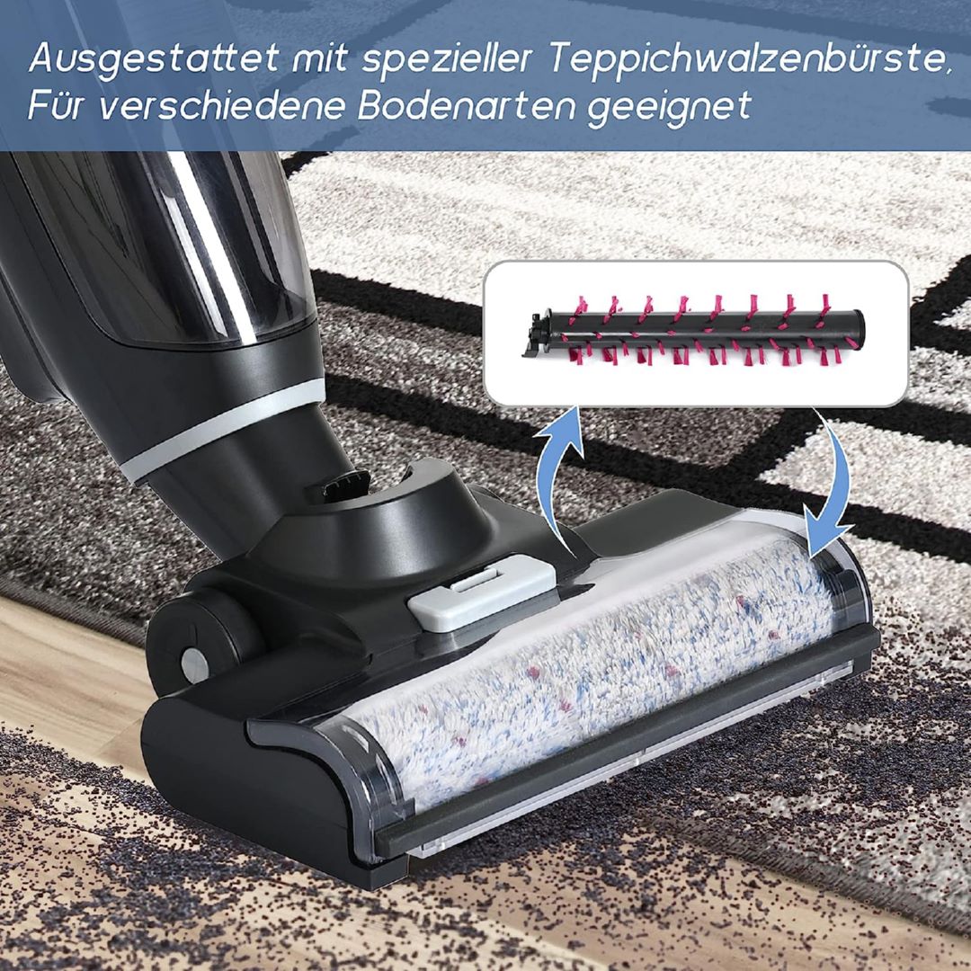 Two roller brushes: special brushes are configured for carpet and floor to achieve a better effect, a brush with bristles for carpet and another brush for the floor. The bristle roller brush can be used to clean deep wool carpets with a thickness of more than 1 cm. This vacuum cleaner can clean carpets, linoleum, floors, wood, tiles and other surfaces.