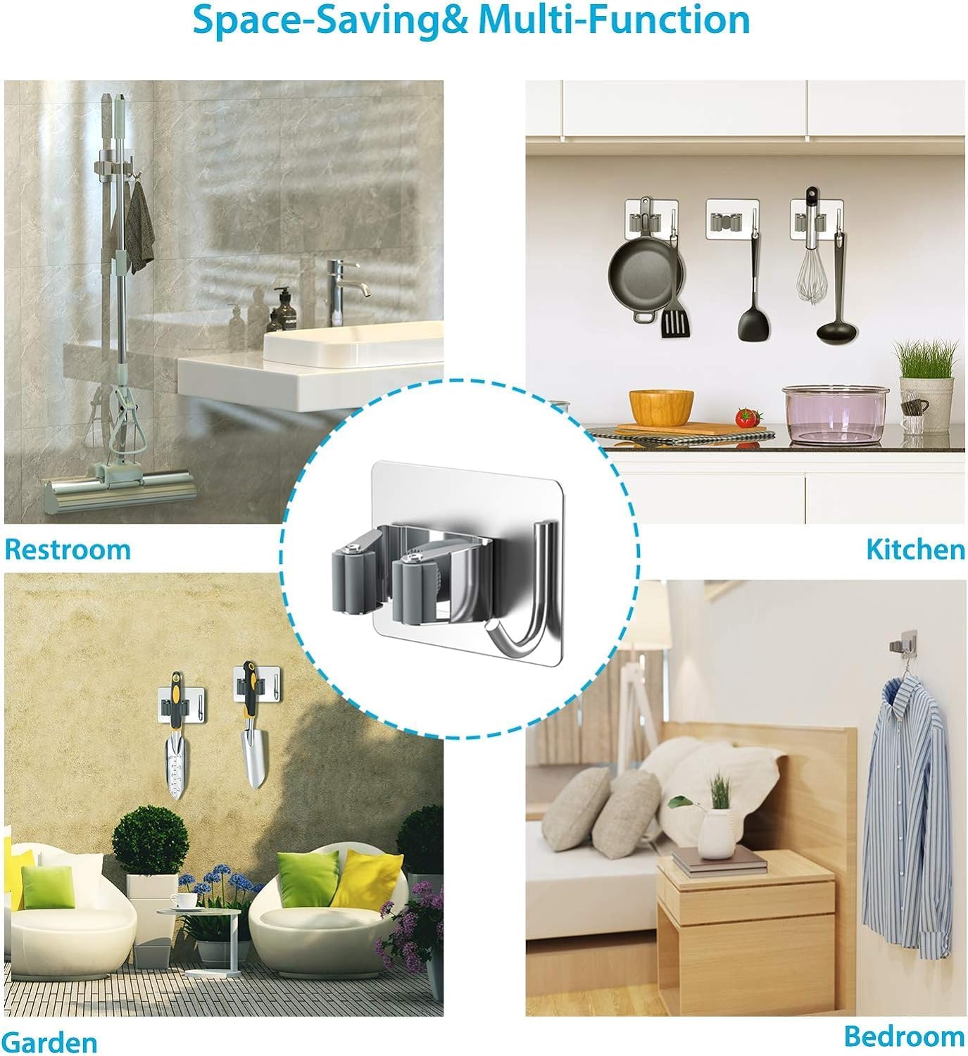 ? Multi-purpose Storage: Self adhesive mop organizer is helpful to organize the mop, broom, umbrella, brush, shovel and other tools, keeping your home clean. The hooks can hang a variety of daily items, improving storage space.