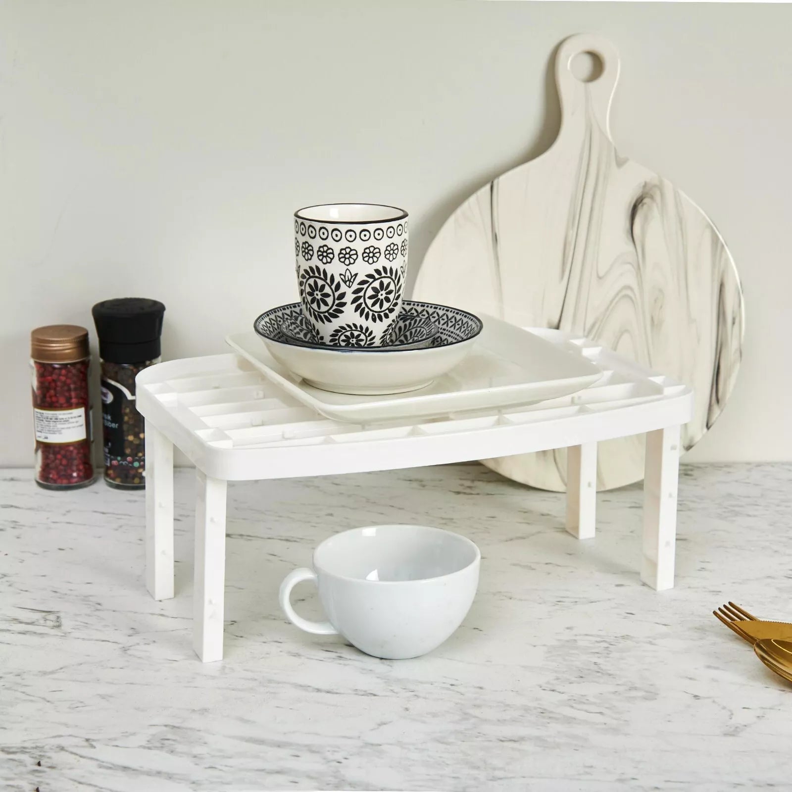 Our product allows you to save space in the kitchen. If you are bored with plates on top of each other in the cupboard, this is the product for you.