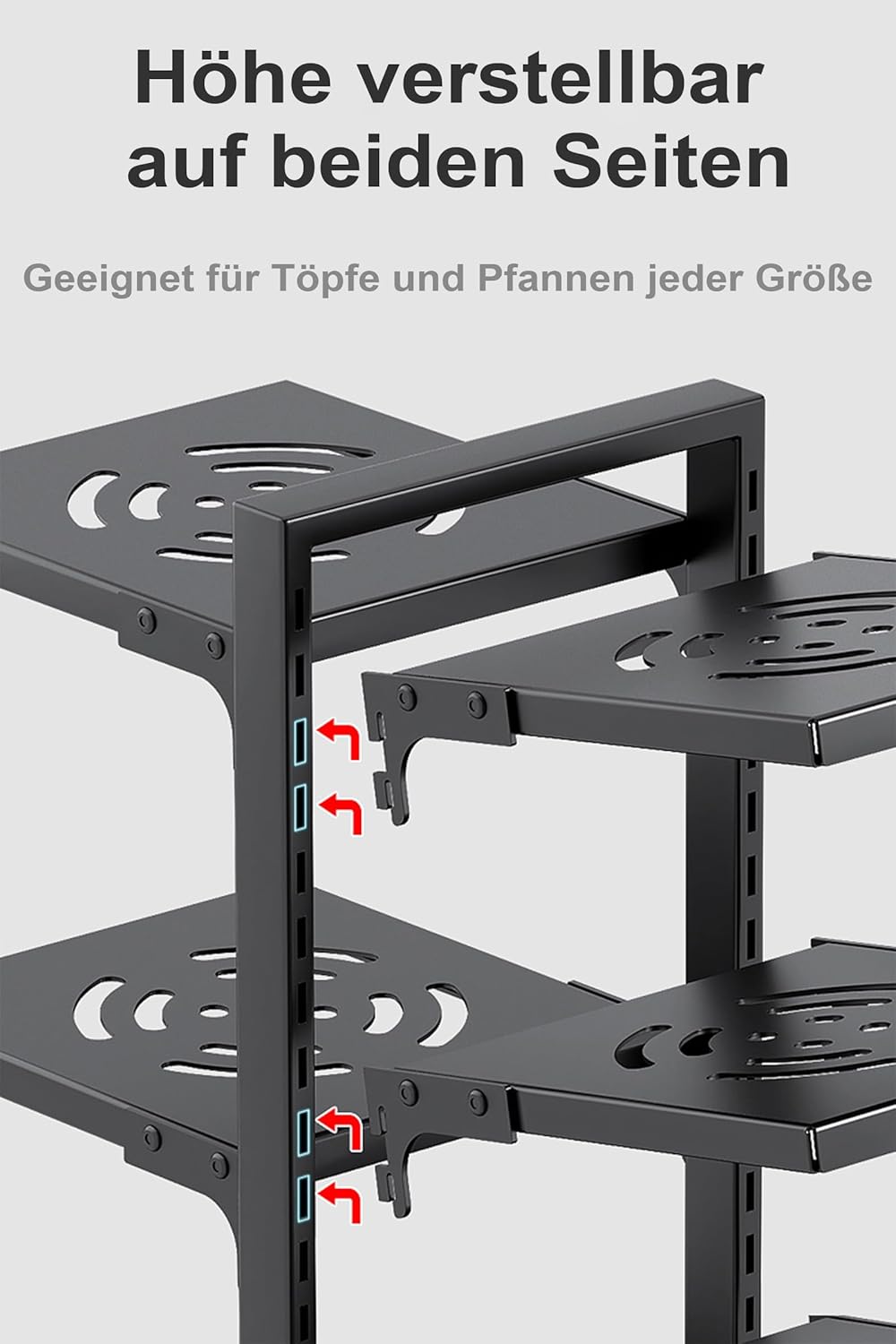 Adjustable shelves: This pan shelf organizer comes with 7 adjustable levels. Fits all sizes of pots and pans. Adjust any shelf position according to your pan and pot heights. You can quickly get a heavy iron pan out of the shelf without having to search the whole cabinet.