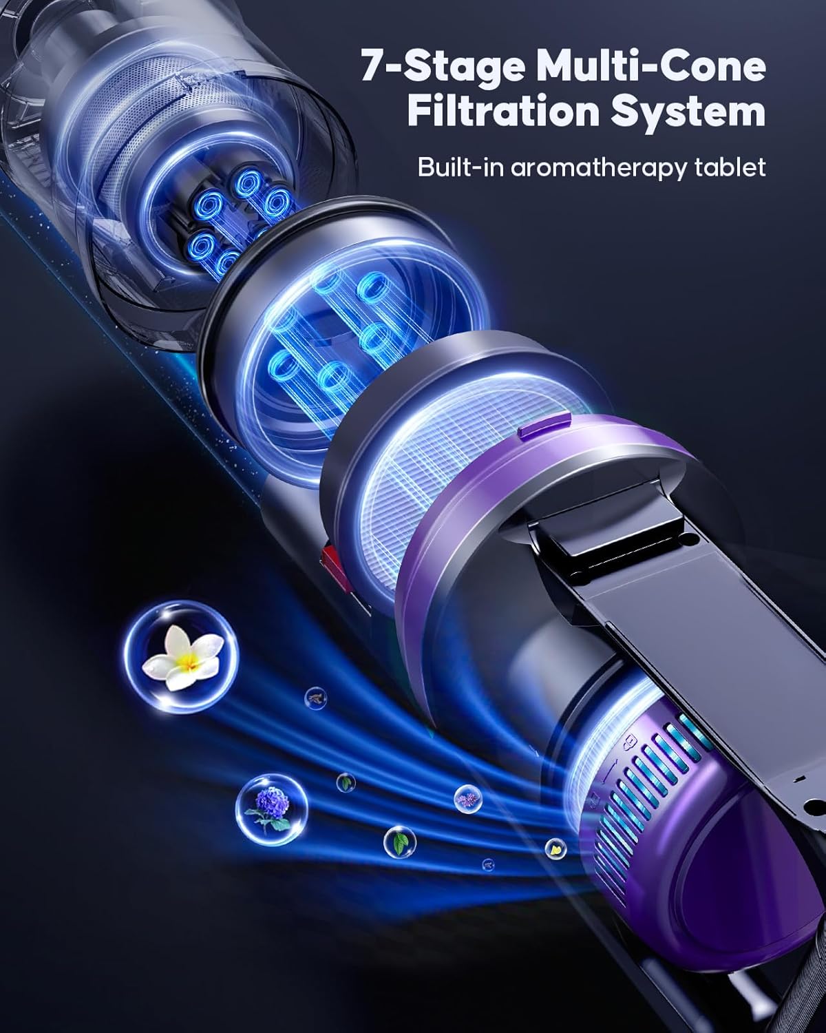 7-layer Filtration Aroma System The vacuum cleaner adopts 7-stage multi-cone filtration technology, which ensures that 99.99% of dust and debris are filtered into the dust cup layer by layer, and stick vacuum cleaner equipped with a built-in aromatherapy piece to release fresh air.