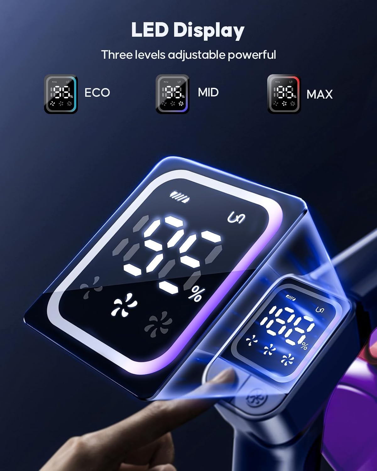 Display Mode & Memory Function The lightweight vacuum cleaner uses a smart LED screen to monitor the indicator light and status of the vacuum cleaner in real time. Display power mode, run time countdown and maintenance alarm to enjoy smart cleaning. Three suction modes (Eco/Mid/Max) have memory function, when vacuum is turned on, it defaults to the suction level you used last time, let you to set your own preferred level.