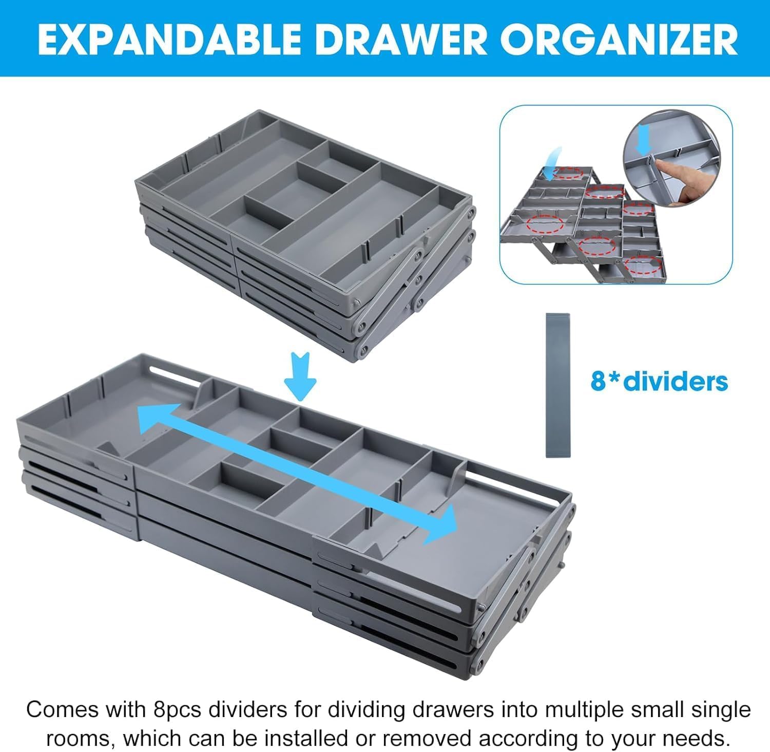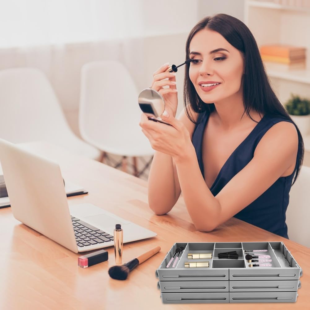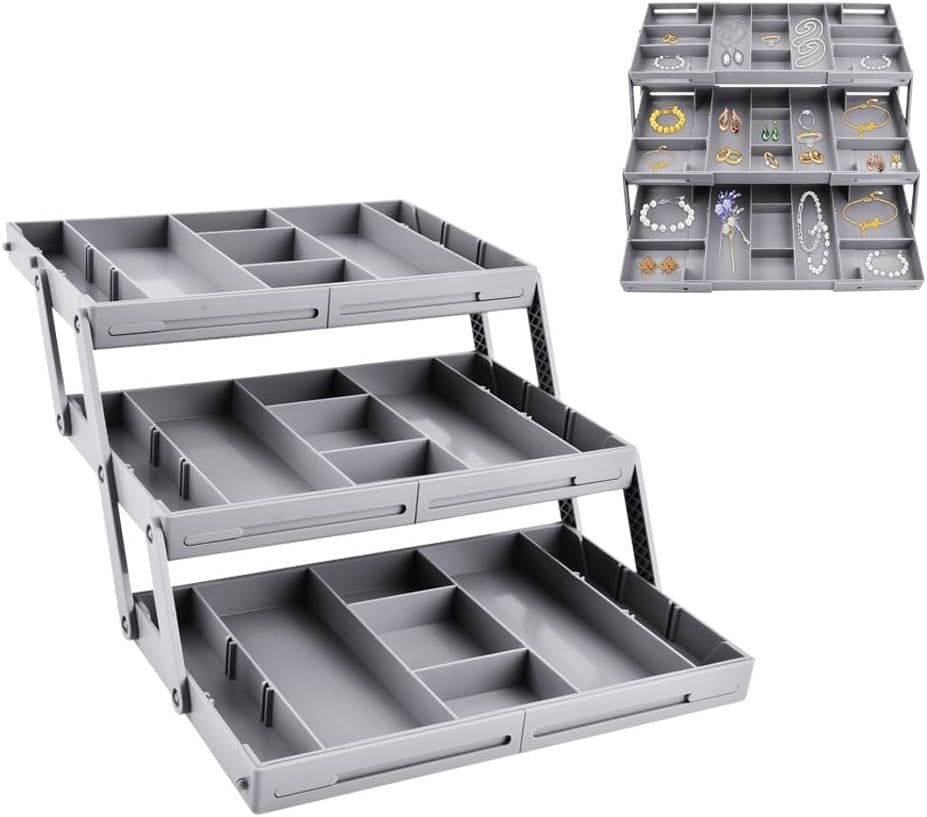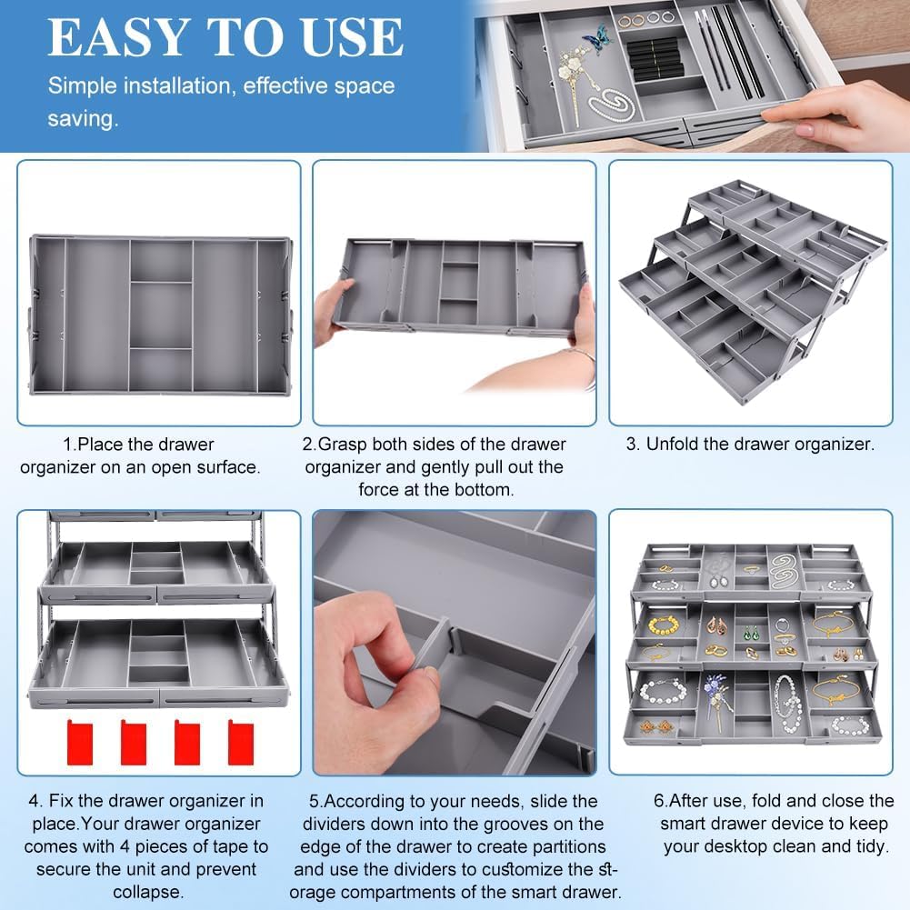 ā¤ćšš®š¬ššØš¦ šššØš«šš š šš«š¢š©š„šš¬ šš«šš°šš« šš©šššć....... Maximize drawer storage space with this 3-tier expandable drawer organizer. The 8 dividers can adjusted or removed as needed. At 2.65 inches high, this collapsible storage organizer fits most standard drawers.