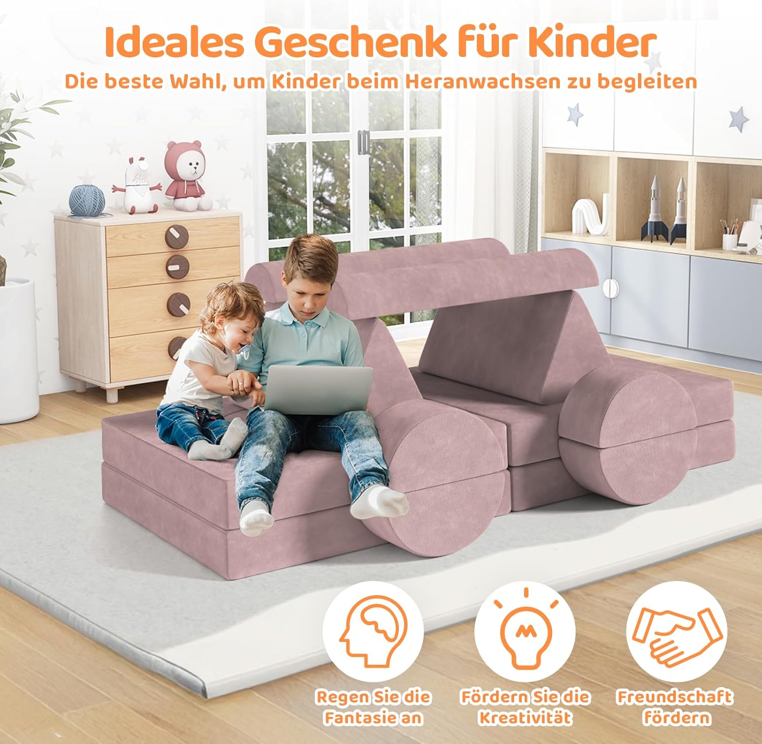 A CE-certified, kid-safe modular sofa made of soft velvet and high-density foam. It includes 14 foam pieces for imaginative play-cars, castles, tents, and more. Ideal for bedrooms and playrooms, the cover is machine washable and easy to maintain.