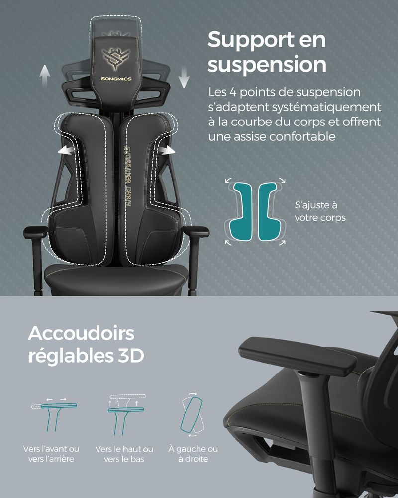 [Hanging backs] The 4-point suspended support of the H-shaped backrest effectively distributes pressure to the back, providing the player with robust and comfortable support for their lumbar during extended gaming sessions