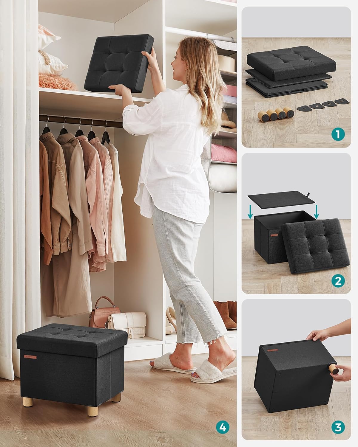 Sturdy and beautiful: characterized by the faux linen fabric with precise stitching, this ottoman looks very elegant; Thanks to the thick MDF board on the top and sides and metal corners on the lid, it can hold 300 kg