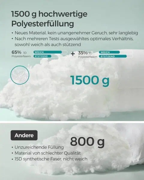 Well filled: With 65% soft 3D polyester fibres, 35% supportive 7D polyester fibres and a filling weight of 1500 g, this bed pillow provides a comfortable hold and ensures sweet dreams