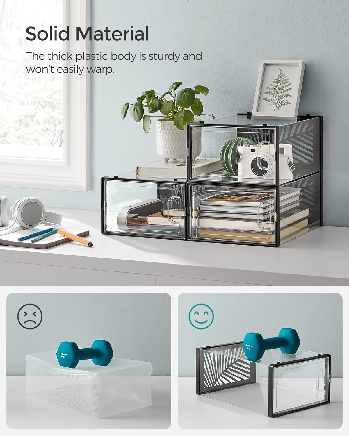 [Stable and Space Saving] The high quality PET material combined with ABS frame with cutout design makes the shoe boxes stable even when stacking. Make the most of your space and show off your shoes
