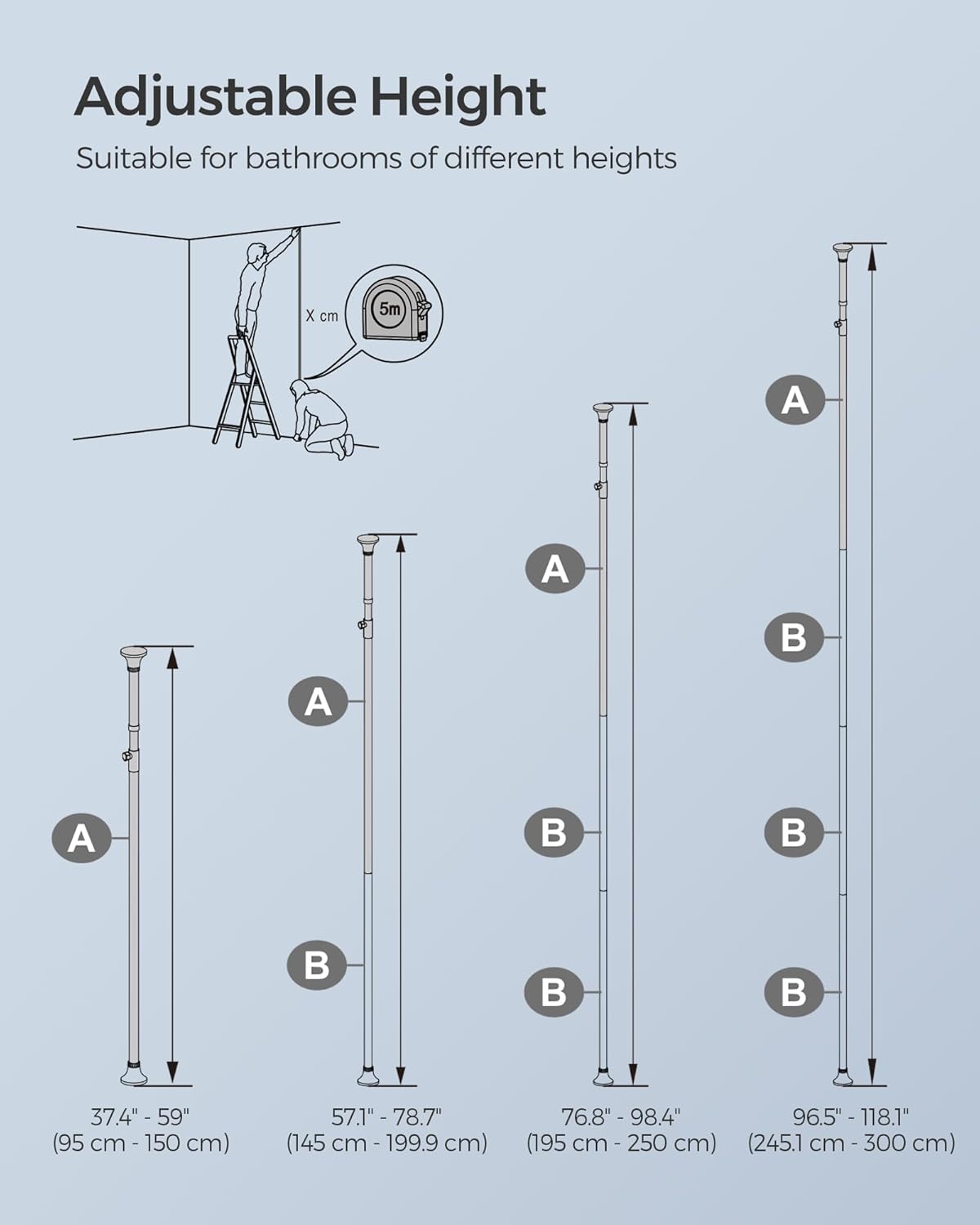 [Accommodates Various Bathroom Heights] This telescopic floor-to-ceiling shower shelf, adjustable from 95-300 cm, is suitable for bathrooms of diverse heights