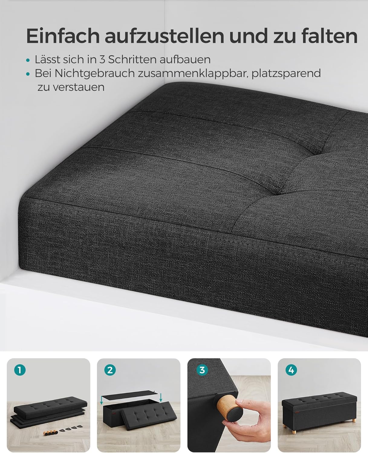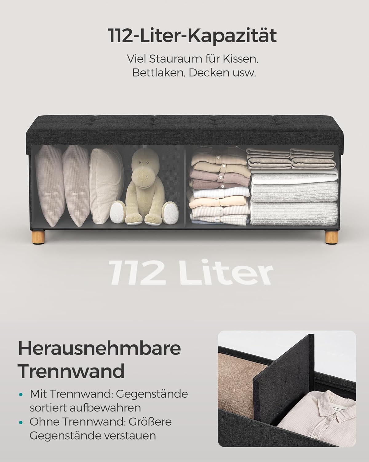Ample storage space: with the dimensions 38 x 110 x 40 cm, this bench offers a large storage space of 112 litres for your books, blankets and bedding. In addition, a removable divider is included to keep your things sorted