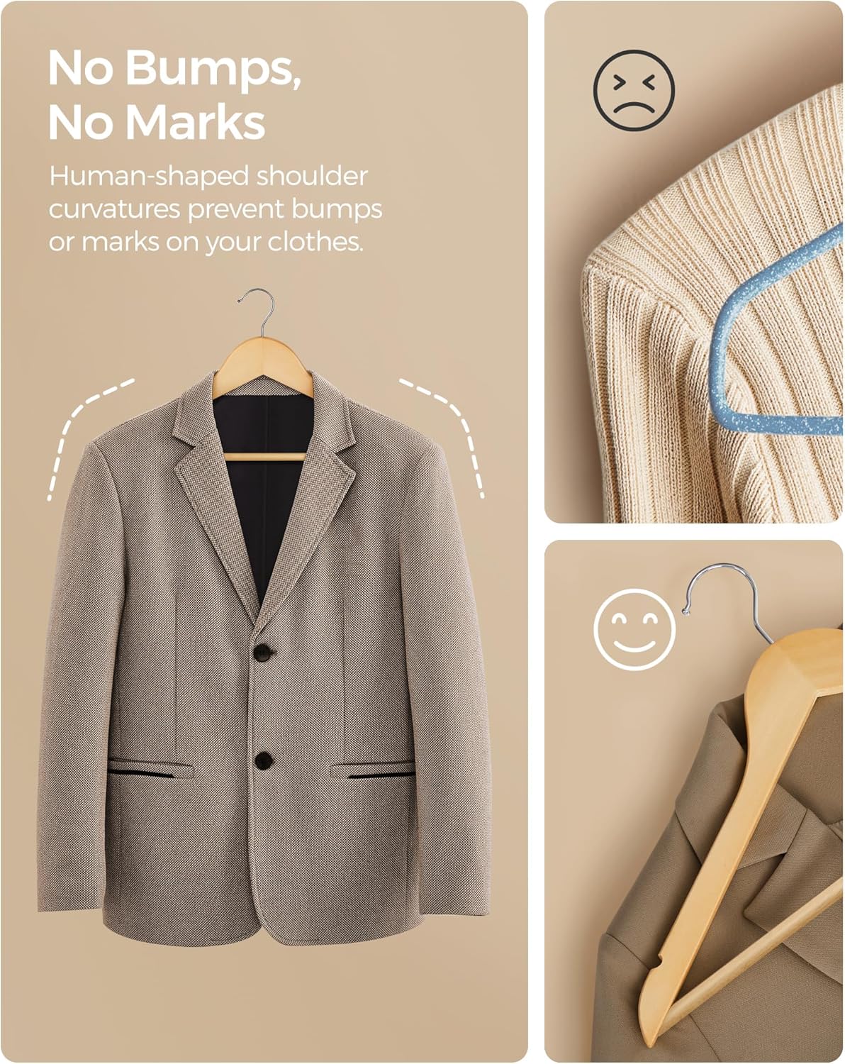 [Bump-free Hanging] No more embarrassing bumps in the shoulders of your suits; these wooden hangers are curved to mimic your shoulders and take good care of your delicate clothing