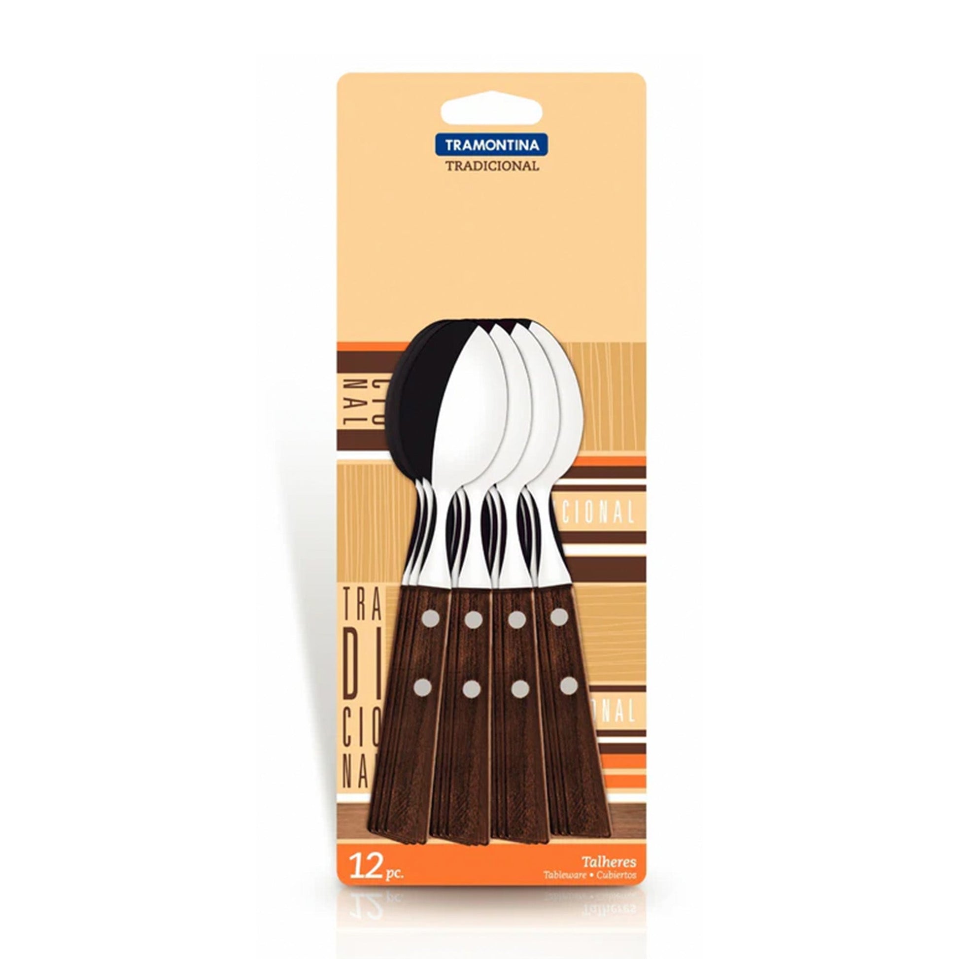 Add a touch of timeless rustic charm to your cutlery collection with this high-quality set of twelve spoons from Tramontina's renowned Traditional line. Expertly crafted for both durability and style, each spoon features a polished stainless steel head that ensures resistance to rust and maintains its shine even with daily use. The handles are fashioned from genuine natural wood, providing a warm, comfortable grip that beautifully contrasts with the metal, and are securely fastened with heavy-duty rivets for maximum structural integrity. Perfectly suited for serving tea, coffee, or desserts, this set combines functional resilience with an authentic, classic aesthetic that enhances any dining occasion.