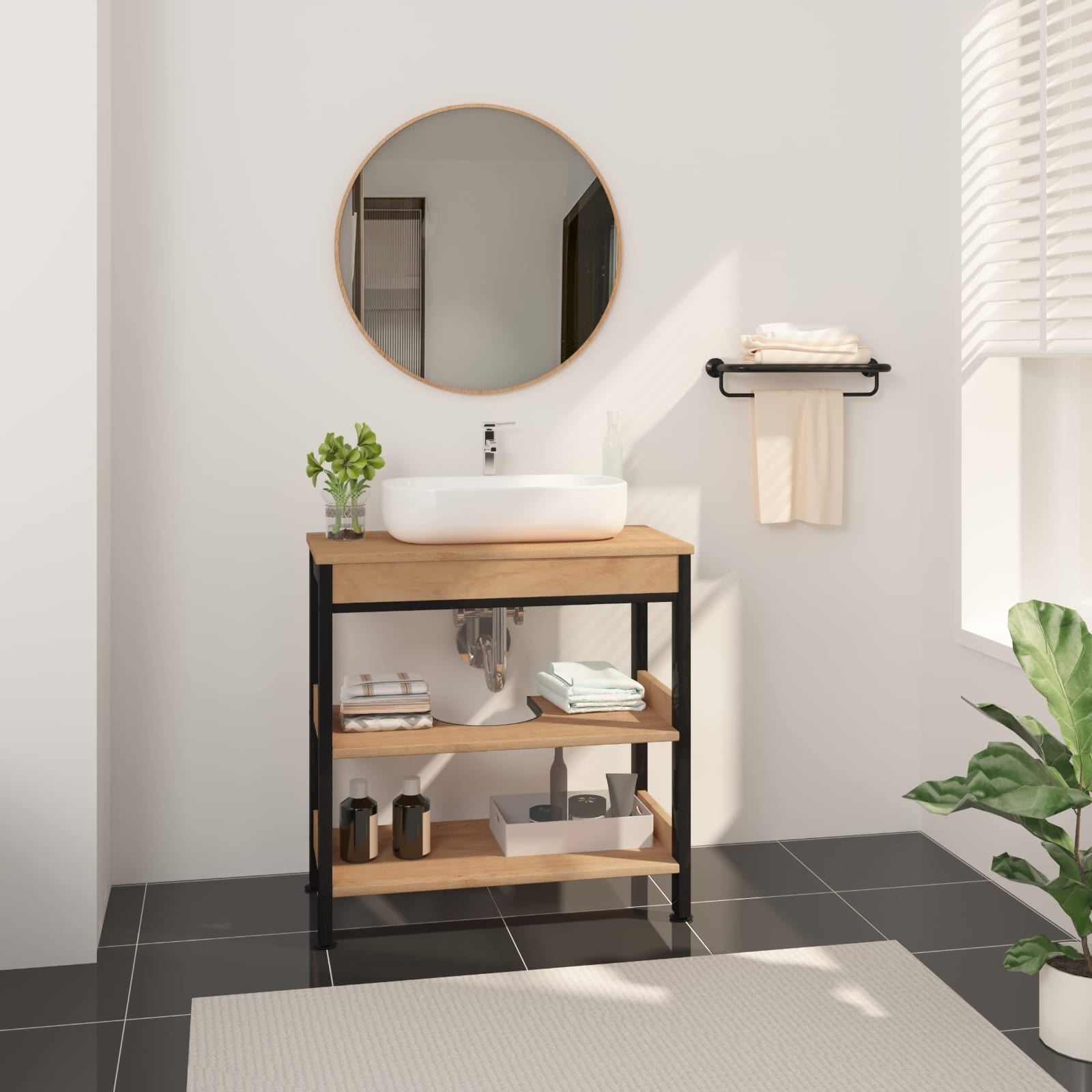 Under Sink Bathroom Cabinet with 3 Shelves on Stand, Storage Shelf Under Sink Metal Structure – Artificial Wood, Light Oak – Black, 60 x 30 x 60 cm