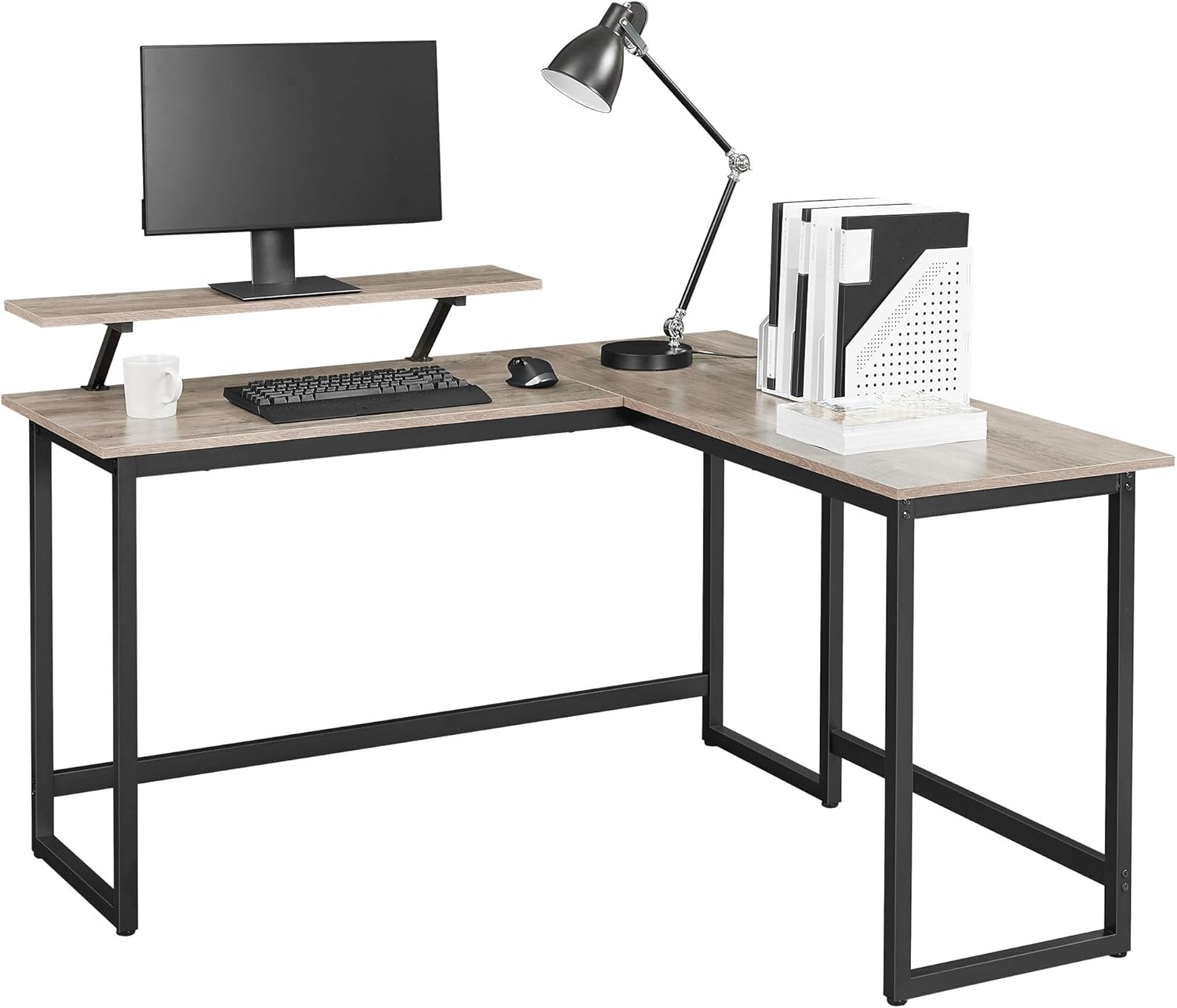 A Bit More Practical: This stylish, greige computer desk not only has a captivating L-shape and fits every corner to save space, but it's also equipped with a practical 7.9''x 35.4'' monitor stand that can be mounted anywhere along the edge of the table