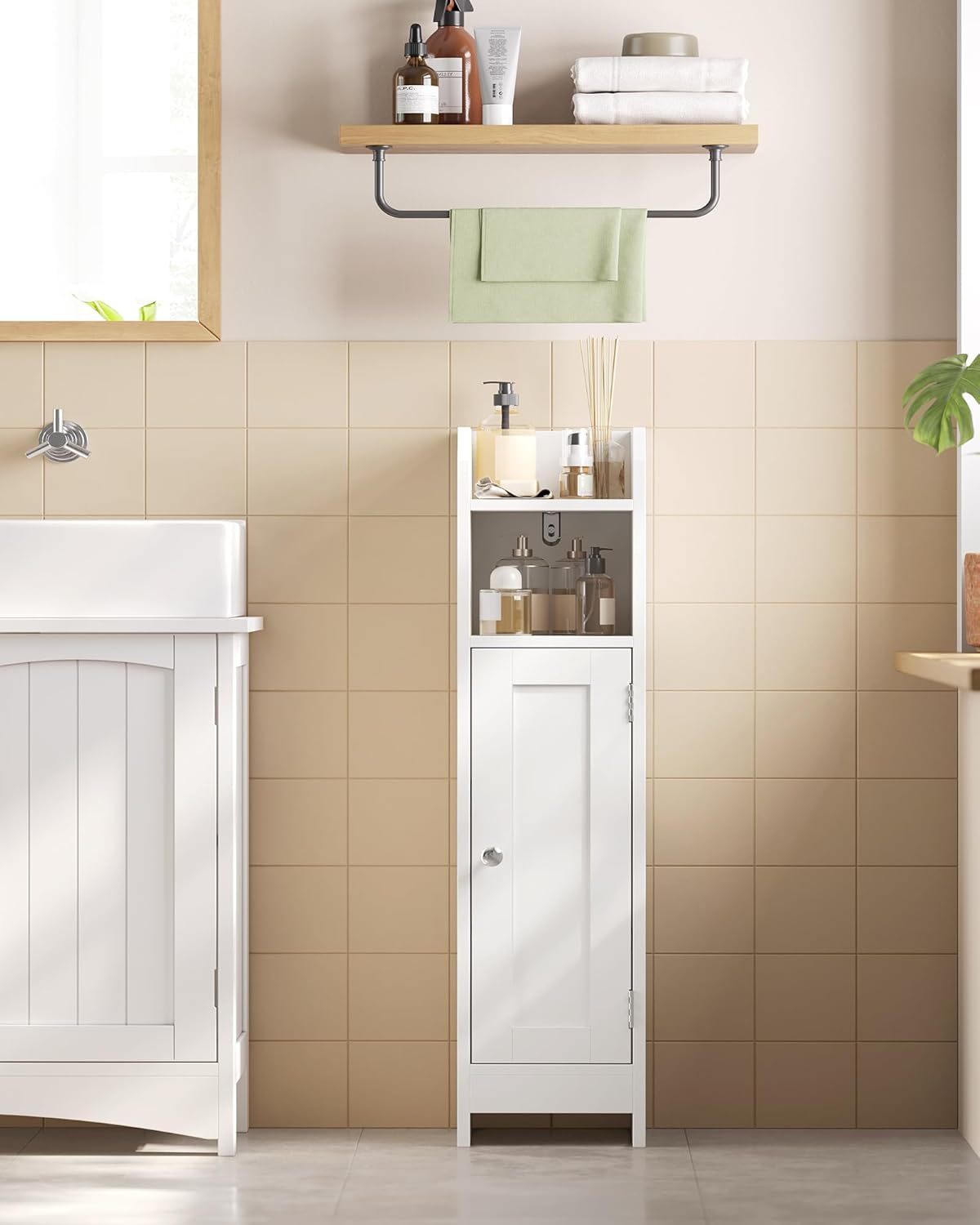 [Adjustable Shelves] The 2 adjustable shelves behind the cabinet door can be adjusted up or down by 1.3", allowing this narrow bathroom storage cabinet to accommodate items of various sizes
