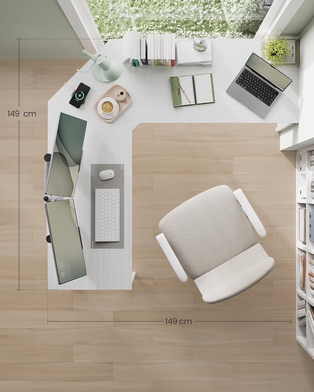 ?Space Saving & Large Area?With corner design, this L-shaped desk saves space while providing a work surface of 149 x 149 cm, accommodates 3-4 computer monitors and other small items - everything is at hand!