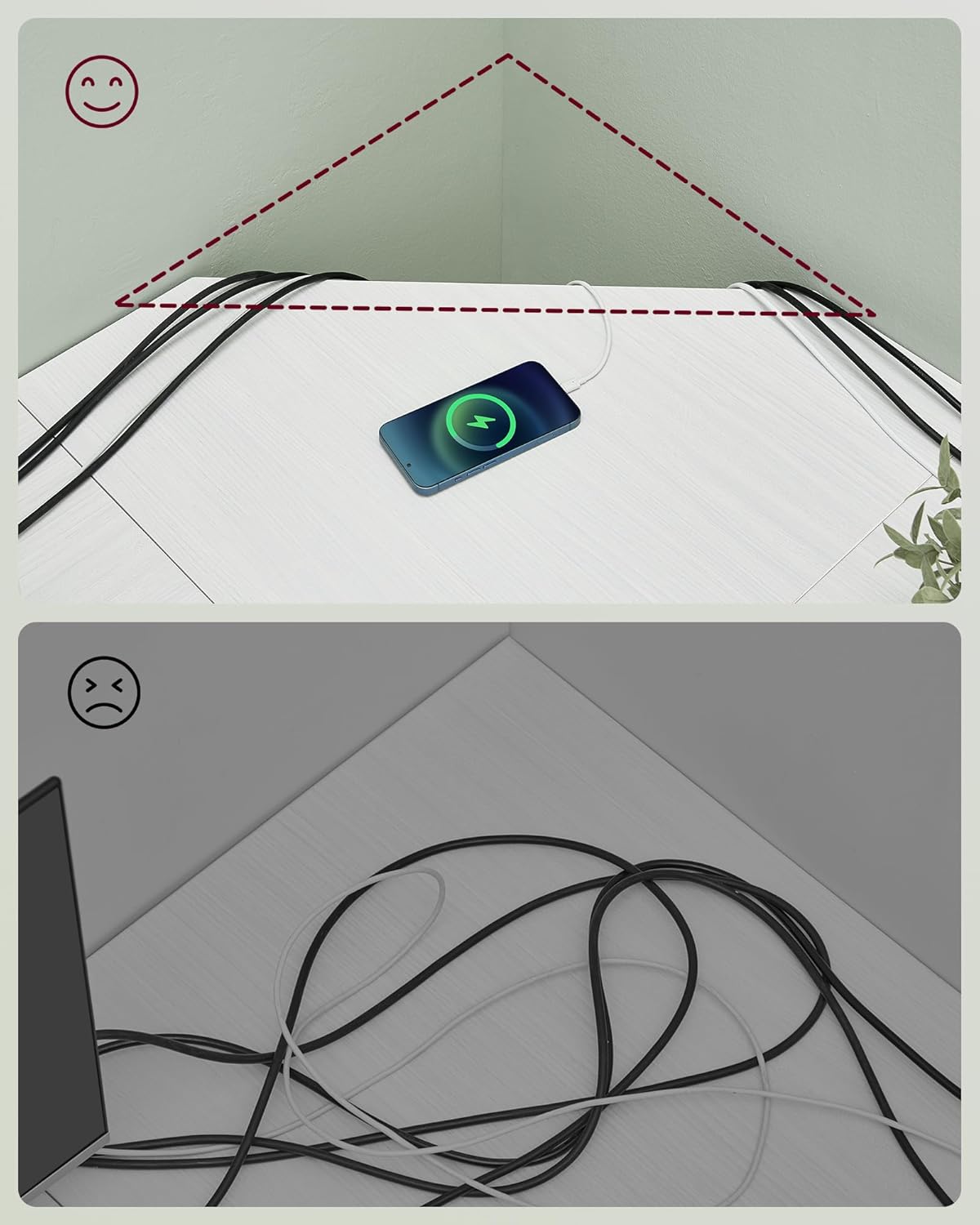 ?Clean Cable Management? The back corners of this corner desk are beveled to allow cable through. The latter, well managed, no longer clutter the desk which remains clean and tidy