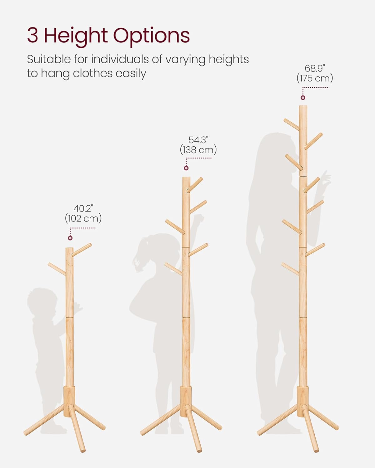 3 adjustable heights, your different needs: Thanks to its 3-part structure, the height of this coat rack is adjustable. For children, it is enough to assemble 1-2 parts. For adults, it is advisable to assemble the 3 parts