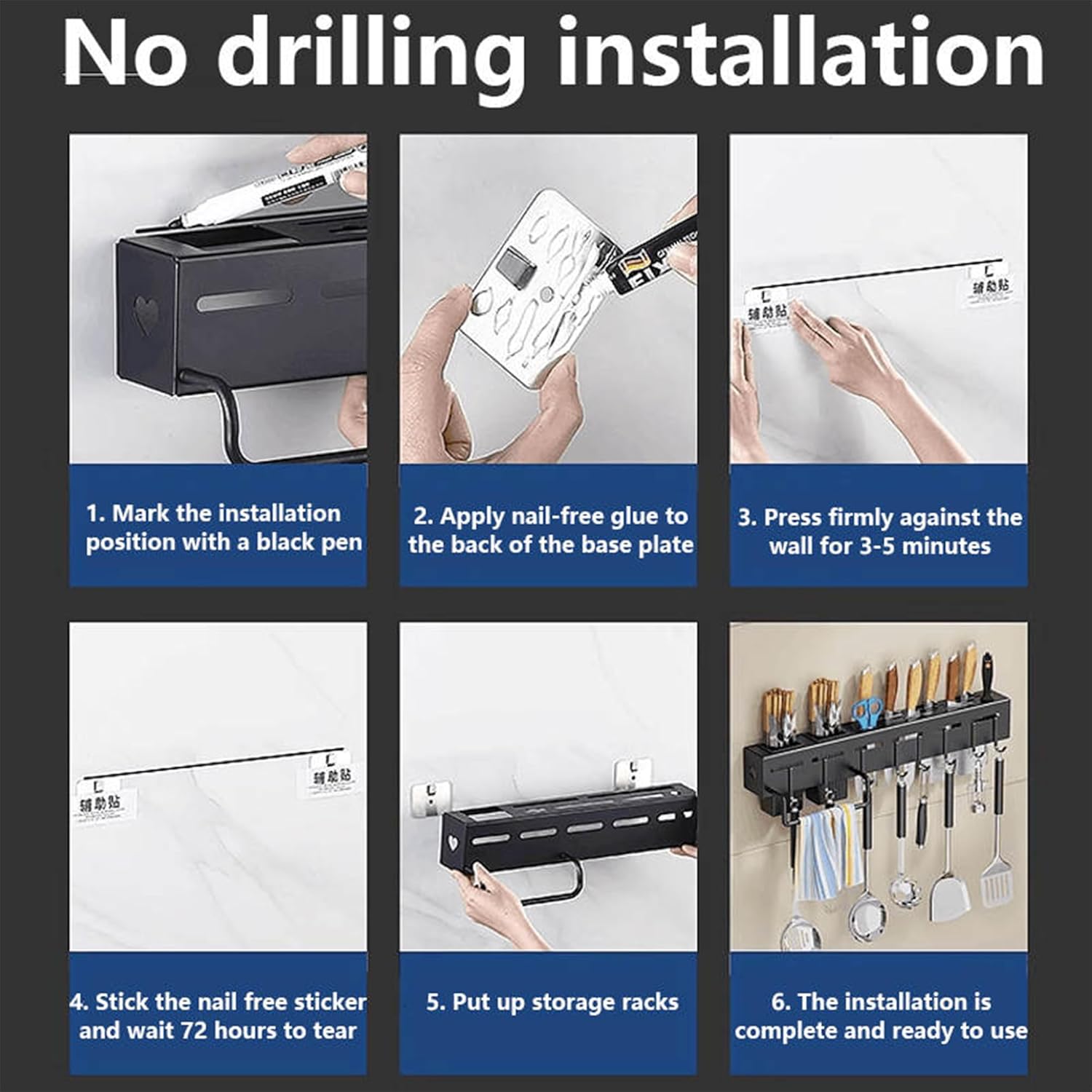 NO HOLES INSTALLATION: Our kitchen organizer consists of types of installation. With its strong hold adhesive glue that is included in the packaging and drilling installation for stronger weight capacity.