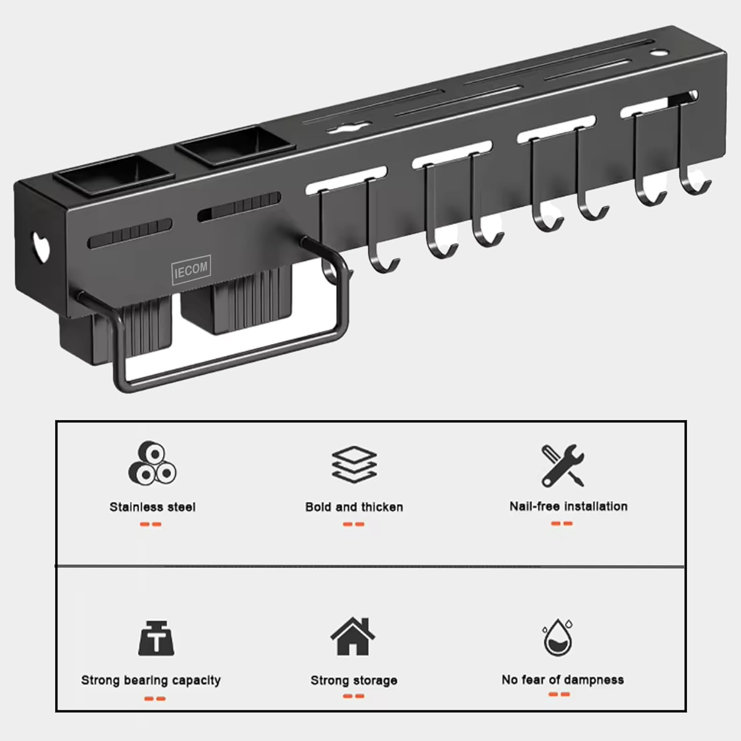 HIGH-QUALITY MATERIAL: This kitchen utensil organizer is made with high-quality stainless steel for 100% rust resistance. Hooks and towel bar ready for kitchen organization and can hold 40 pounds of weight without even bending or deforming and powder-coated finish for dustproof and easy cleaning.