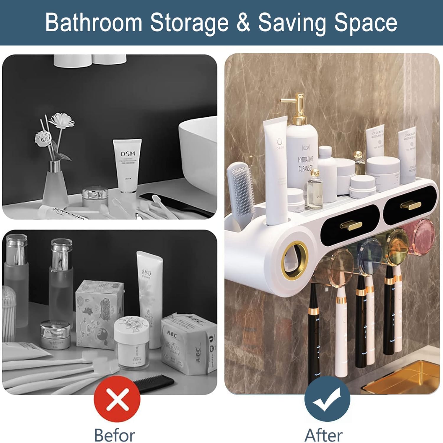 Multifunctional combination: toothbrush holder with double toothpaste dispenser automatic has 5 main functions, storage compartment, toothpaste dispenser, water cup and toothbrush holder, cosmetic storage table, drawer storage box; 5 main compartments correspond to different functions, scattered storage and lead a new washing trend and storage.